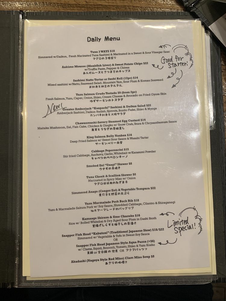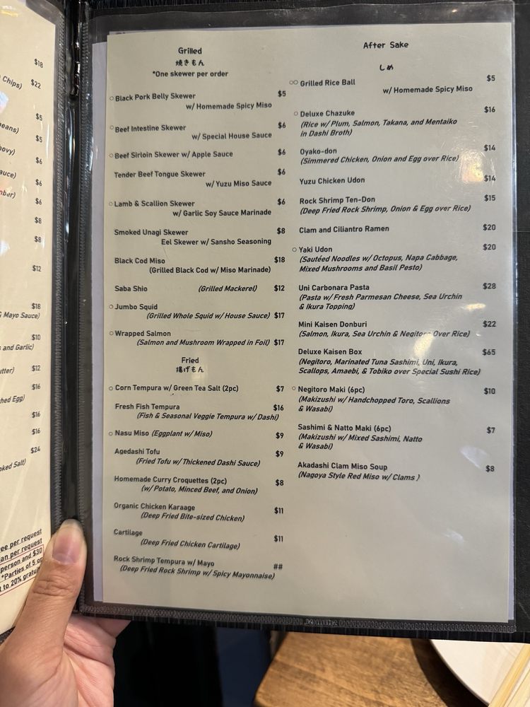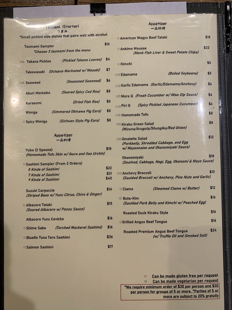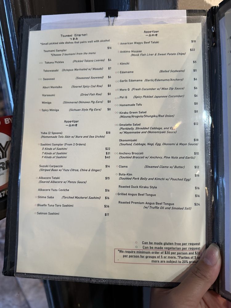 Introducing the menu at Kiraku, an Izakaya specializing in Tapas/Small Plates in Berkeley, CA. This vibrant restaurant offers a variety of dishes, from Takoyaki and Grilled Miso Salmon to Corn Tempura and Homemade Daikon Tsukemono. Highlights include the Snow Crab Chawanmushi, Sashimi Salad, and Yuzu Cheesecake. The menu caters to Pescatarians, Vegans, and those with limited Vegetarian options. With a cozy and inviting ambiance, Kiraku provides excellent service, making every dining experience memorable. The extensive drink selection includes Oi-Ocha Green Tea and Kimino Sparkling Yuzu. Overall, Kiraku is the perfect spot for a date night or casual dinner, offering a fusion of traditional Japanese flavors with a modern twist.