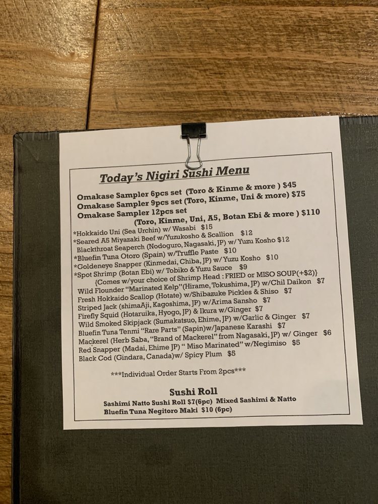 4pc of seared otoro (bluefin fatty tuna) topped with yuzu kosho (chili paste with Japanese citrus)